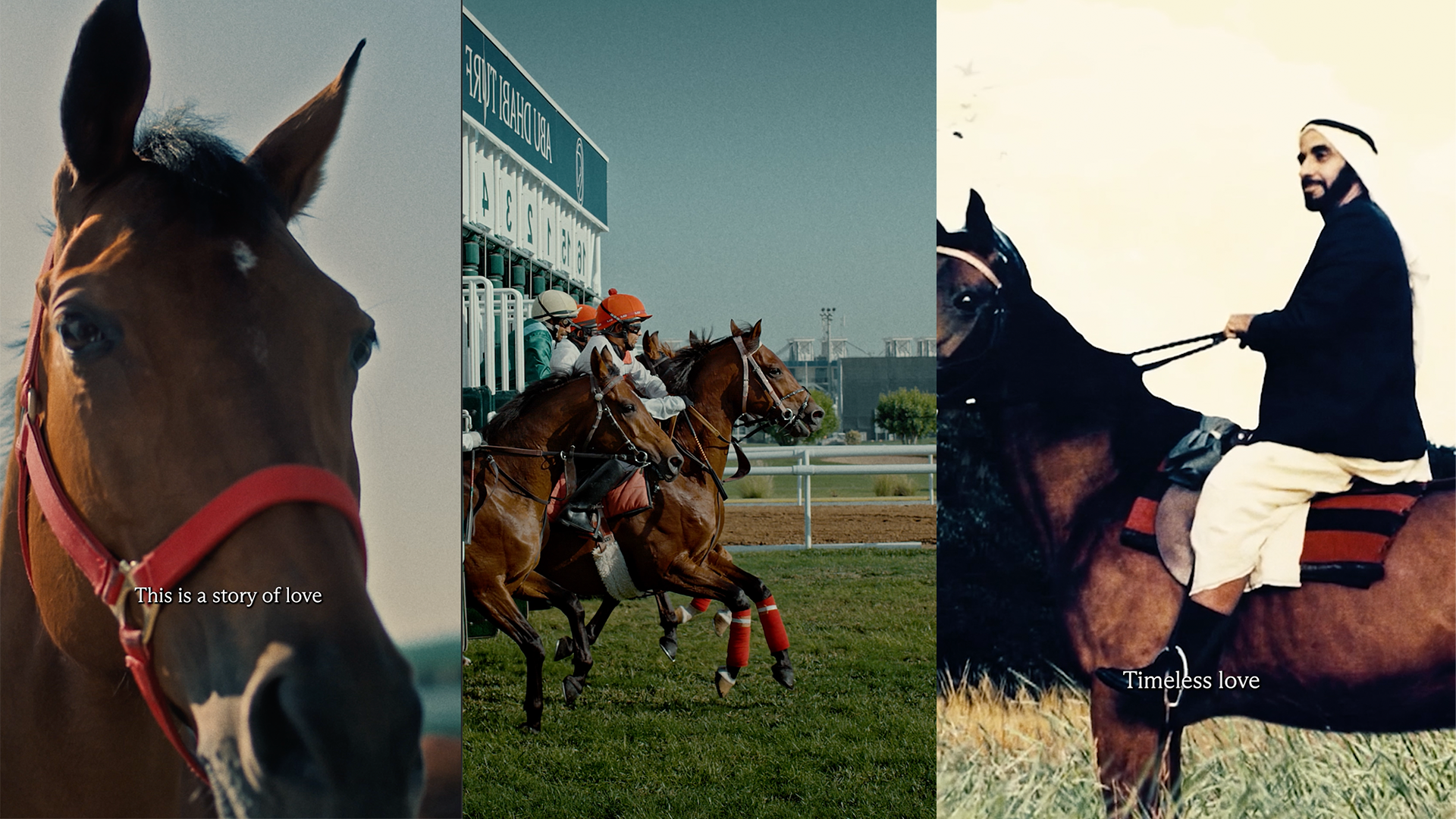 Close-up of a brown horse with a red halter, racing in a race track, with the text 'This is a story of love'. Next image shows three horses racing on the track with jockeys wearing helmets. Third image shows a man riding a brown horse, wearing tradit